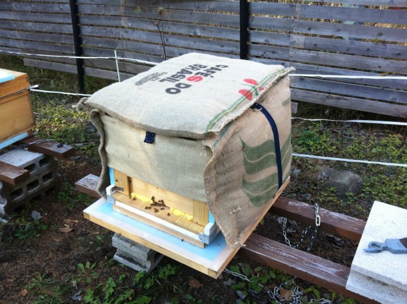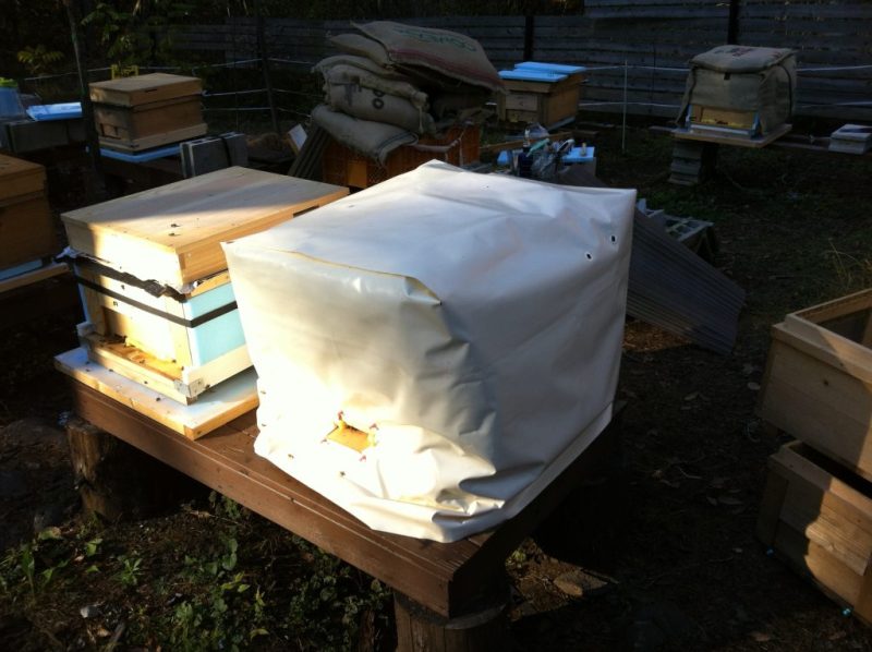 羊毛の断熱材と麻袋で作った布団状のものを巣箱にかぶせて、その上から厚いビニール生地のカバーをかぶせました。