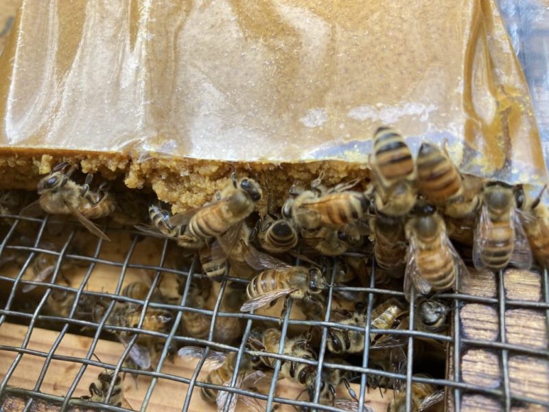 2月の下旬に、巣箱を開けてミツバチの子育てに必要なタンパク質である、花粉パテを入れました。